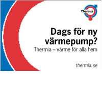 Annonsen visar Thermias stora utbud av bergvärmepumpar med budskapet "Bergvärmepumpar för alla hem".