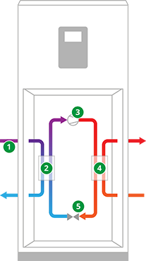Det är kylkretsens kompressor som gör det möjligt för din värmepump att lämna energin vid en högre temperatur än den hämtas upp vid. Detta sker genom en process där trycket ökas och minskas i olika delar av kylkretsen (den exakta funktionen beskrivs nedan).